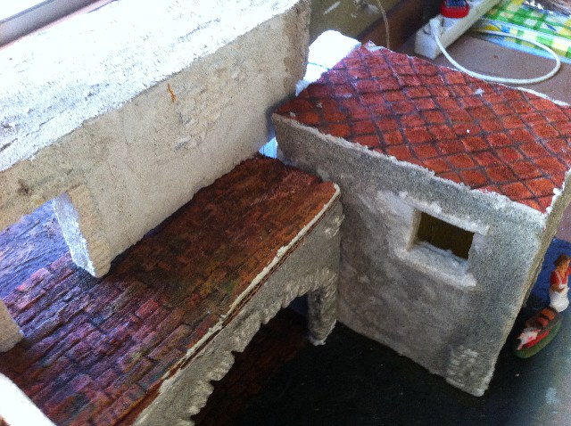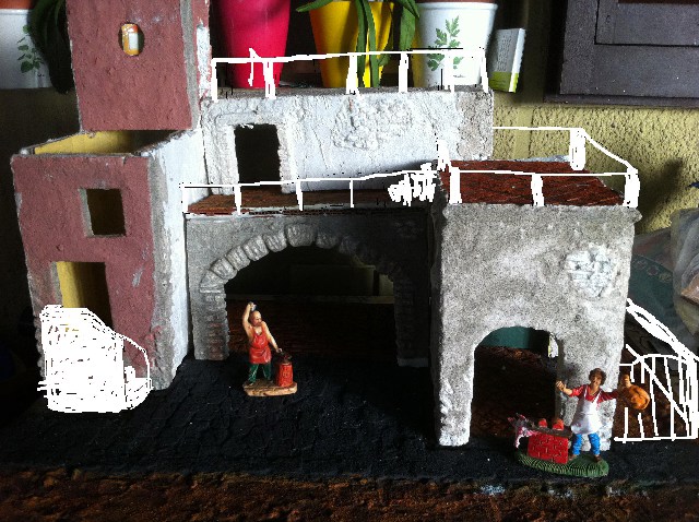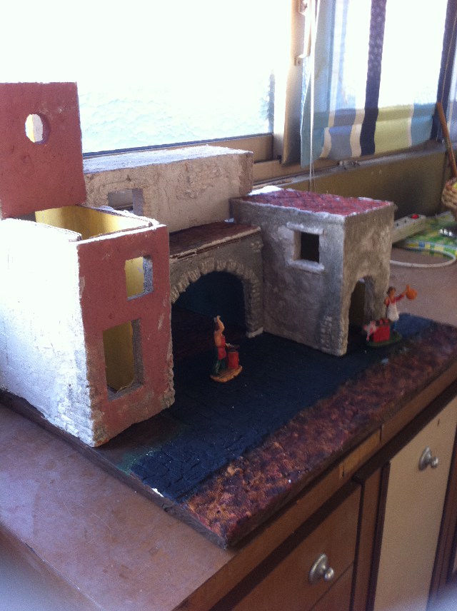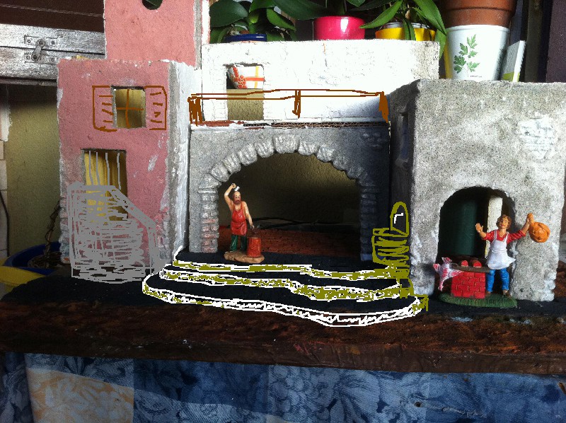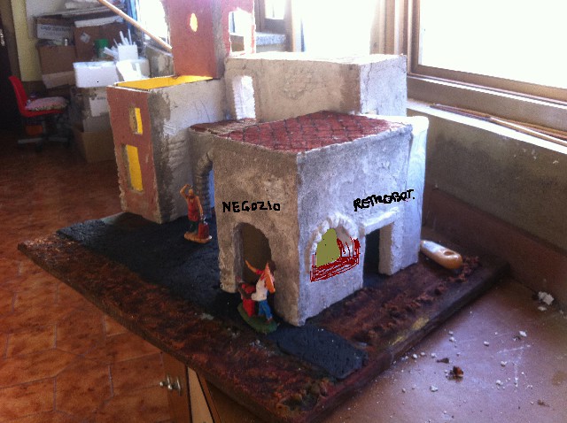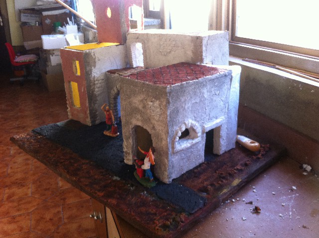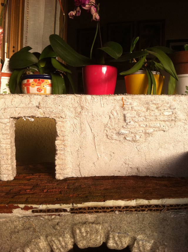 Il presepe è quasi finito devo solo inserire l'albero e stuccare il muro sulla sinistra,non ho potuto rialzare la parte centrale con le scale come avevo disegnato perche'la mia collega,a cui va il regalo, lo preferiva come lo avevamo ideato, nello stesso tempo ho cercato di correggere gli errori che avevo fatto.Tutto sommato,a mio avviso,il risultato finale non è male so che poteva venire meglio ma sono i primi passi , come ho gia' detto, con polistirolo, scagliola con rena e altra robaccia , balsa e adesso aspetto il vostro giudizio