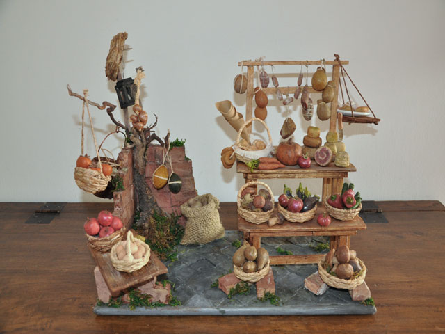 ho usato colori a tempera per la muratura, mordenti per il legno e per la rafia dei cestini ed infine per tutti gli oggetti in cera, in fase di scioglimento, uso pastelli a cera