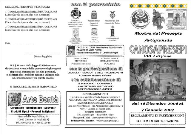 CARISSIMI AMICI DEL PRESEPIO ELETTRONICO LA NOSTRA SEZIONE DI CANOSA DI PUGLIA DELL'ASSOCIAZIONE ITALIANA AMICI DEL PRESEPIO ORGANIZZA L'OTTAVA EDIZIONE DELLA , QUESTA MOSTRA POSSONO PARTECIPARE TUTTE E'GRATUITA CON QUALSIASI PRESEPE o DIORAMA .