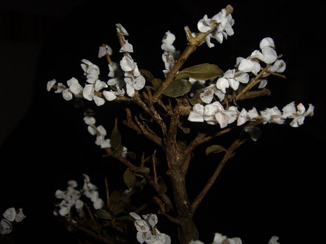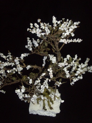 Ciao Fabio, la mandorla è un secco bonsai. I fiori sono fatti da carta igienica. Si perfora la carta ed è simile a coriandoli. Con le dita dare una forma fiore. Incollare la carta al bonsai con gel cianoacrilato.