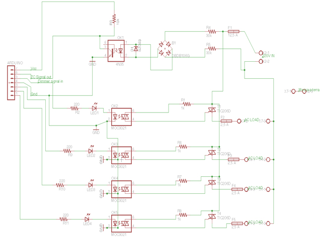 Ciao a tutti, in questi giorni mi sono documentato sul dimmer completamente digitale controllato da arduino e sono riuscito a fare uno schema elettrico con EAGLE CAD, il dimmer ha 3 canali e uno zerocross detector. L'ho controllato attentamente e credo che non ci siano errori, voi che dite? Se è tutto ok procedo con il disegnare la pcb.