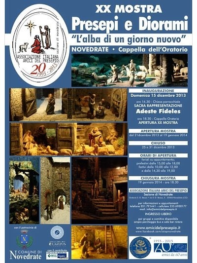 Novedrate - XX Mostra Presepi e Diorami “L’alba di un giorno nuovo” : esposizione di circa 50 Presepi e Diorami di pregevole fattura , inediti con statue pezzi unici di scultori rinomati Italiani e Spagnoli inoltre Grande Presepio di circa 20 mq. opera di Antonio Pigozzi – Organizzata dalla sezione di Novedrate - Oratorio San Giovanni Bosco – via San Giovanni Bosco 3 / via Cesare Cattaneo 22060 Novedrate CO - Inaugurazione il 15-12-2013 : ore 16,30 rappresentazione Sacra (Adeste Fideles) presso la chiesa parrocchiale in piazza Umberto I° Novedrate CO ore 18,30 benedizione e apertura Mostra. Mostra Aperta dal 21-12-2013 al 19-01-2014; chiuso il 25/12 e 31/12 – orario feriali su appuntamento; prefestivi dalle 15,00-18,00 – festivi 10,00-12,00/14,30-19,00 Info: Flaviano Marzorati tel. 031791441-3356900177-fax031790854. Email: info@amicidelpresepio.it - marzoratiflaviano@gmail.com Web: www.amicidelpresepio.it facebook: AIAP sezione di Novedrate