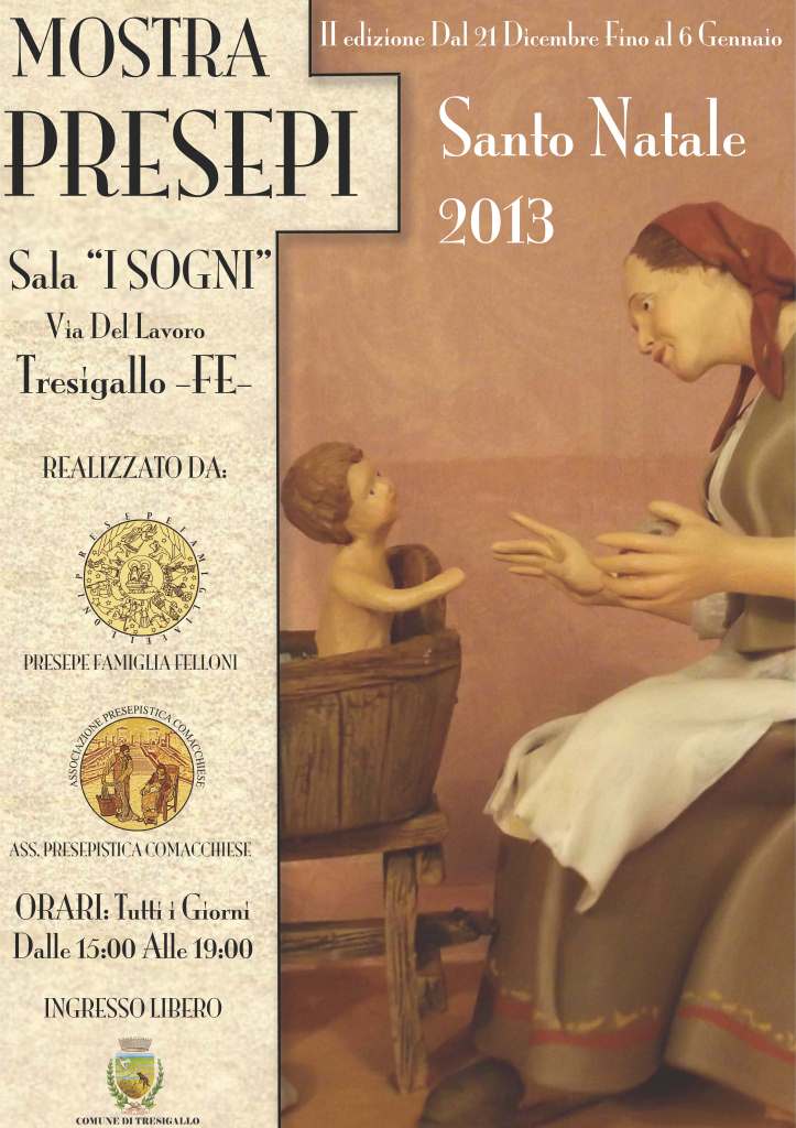 Tresigallo: per il secondo anno consecutivo, anche a Tresigallo grazie all’amico fello84 con il suo staff, ed alla collaborazione con la presepistica comacchiese, viene riproposta dal 21 dicembre al 6 gennaio, la mostra presepi di cui sotto la locandina. Ovviamente, veniteci a trovareeeeeeeeee !!!!!!!