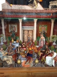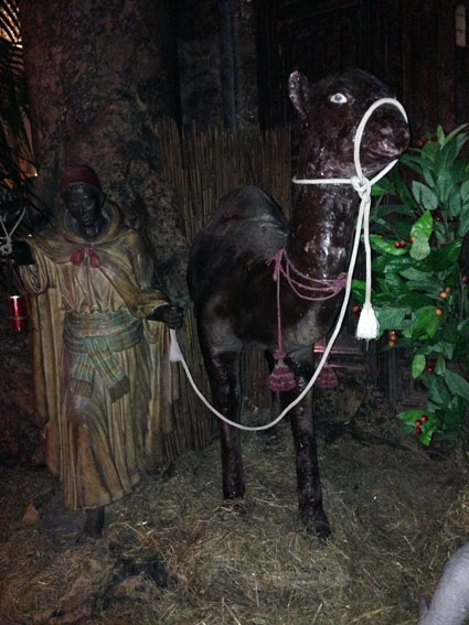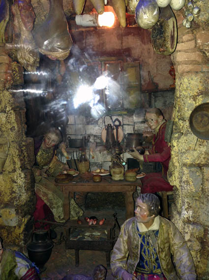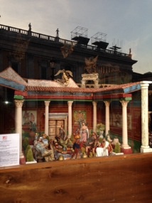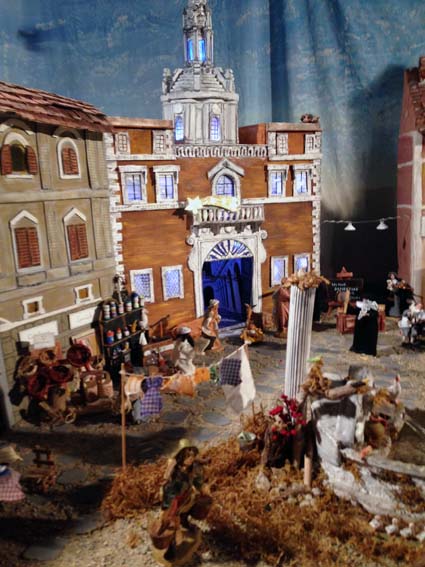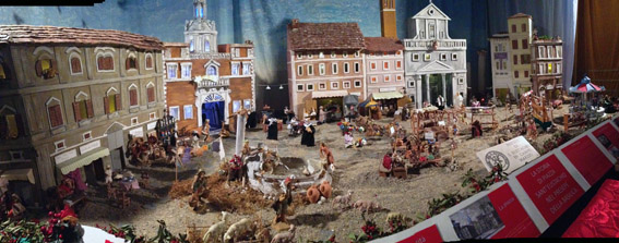 Dopo l'incitamento di Renzo continuo... PRESEPE IN CAMPIDOGLIO E' stato realizzato dalla Cooperativa sociale "Cantiere delle idee" di Palermo. Sono evidenziate due scene di vita quotidiana dell'antica Roma. Una riproduce la "Domus Agreste": dove il patrizio si intrattiene con l'ospite d'onore mentre spettacoli allietano il convivio; l'altra scena e' la taberna: nelle strade del mercato sono rappresentati la fioraia, il venditore di pesce, frutta e verdura; dal piano di sopra alcuni ospiti della taberna scrutano la natività collocata in posizione centrale su cui domina un tempio diroccato. Scenografie in polistirolo e cartapesta, statue in terracotta vestite con stoffe trattate