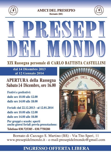 Cari amici, vi segnalo una mostra dell'amico Carlo Castellini, un vero artista dell'arte presepiale. Oltre ai tantissimi presepi raccolti da tutte le parti del mondo, ha in mostra alcune sue opere di pregevole fattura.... non perdetevi la mostra