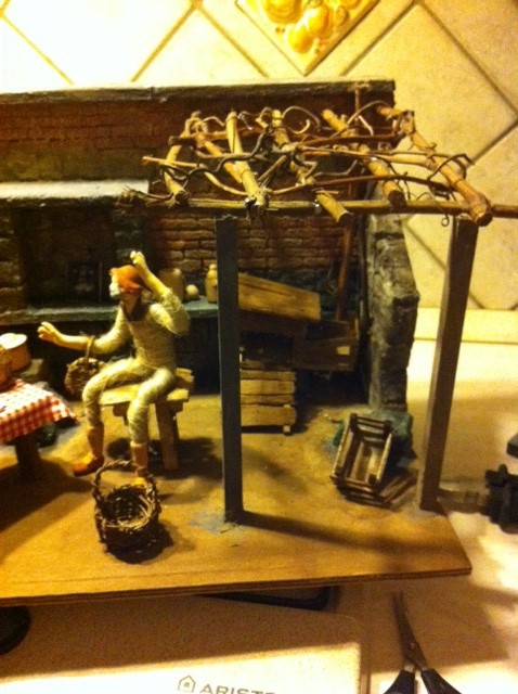 Questa volta ho deciso di lavorare su dimensioni più ridotte e quindi pastori da 15 inseriti in una scena ovviamente più piccola dove in un atmosfera di vendemmia cercherò di riprodurre un pergolato con una vite Queste le prime foto Le mura sono di polistirene inciso con matita e poi ricoperto con miscuglio di gesso cemento a presa rapida e fondi di caffè .. Il tutto è stato dipinto con mordente scurissimo e poi schiarire ocra rossa ocra gialla e bianco per lumeggiare . In alcuni punti ho provato a riprodurre l'ardesia .