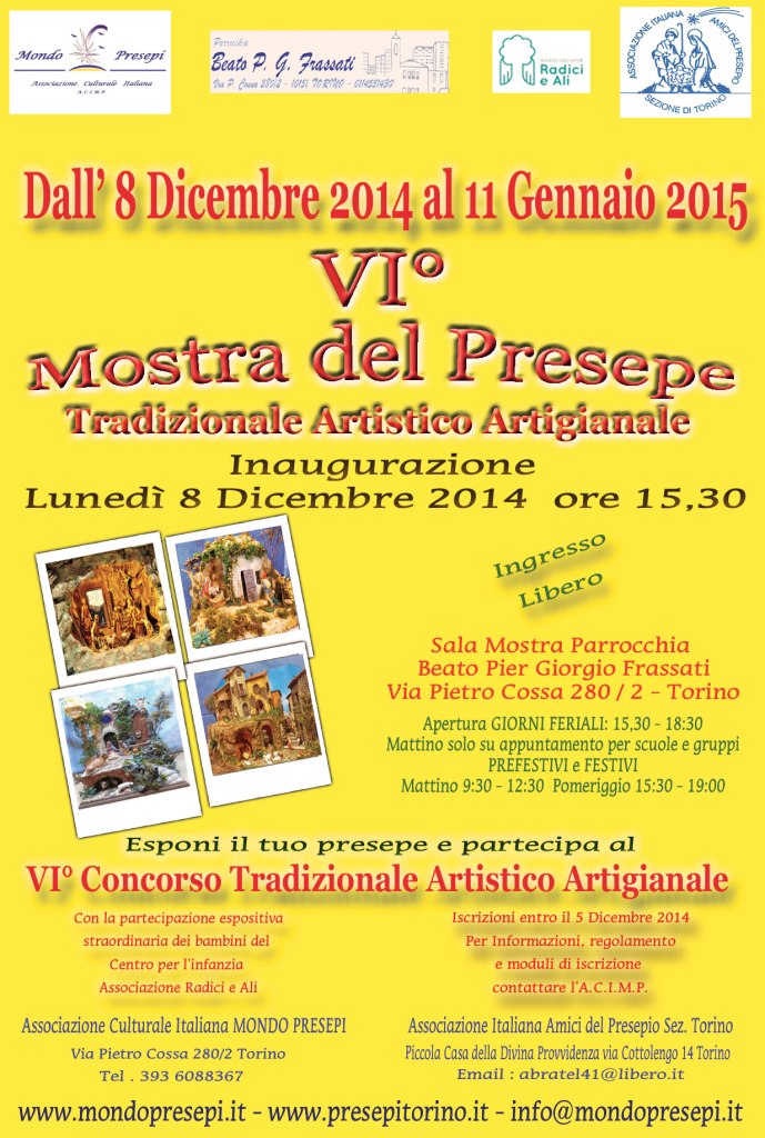 Mancano solo 20 giorni ha Natale, la festa più rinomata dell'anno. L'A.C.I.M.P. Associazione Culturale Italiana MONDO PRESEPI , in collaborazione con la Parrocchia Beato Pier Giorgio FRASSATI di Torino, l'Associazione Radici e Ali e l'Associazione Amici del Presepio sezione di Torino ( A.I.A.P.) non potevano mancare a questo grande appuntamento. L’inaugurazione della MOSTRA di PRESEPI "Tradizionali Artistici Artigianali" giunta alla VI° Edizione, diventata punto di riferimento per molti fedeli ed appassionati del Presepe, verrà celebrata l’ 8 dicembre 2014 alle ore 15.30 presso la sala mostre della Parrocchia Beato Pier Giorgio Frassati sita in via Pietro Cossa 280/2 a Torino. La Mostra sarà aperta con INGRESSO GRATUITO dall'8 dicembre 2014 al 11 gennaio 2015, nei giorni FERIALI con orario 15,30 - 18,30, nei giorni PREFESTIVI e FESTIVI con orario 09.30 - 12.30 e 15.30 - 19.00; aperture straordinarie saranno possibili nei giorni feriali di mattina solo su appuntamento per scuole, gite, gruppi. L’intento dell’A.C.I.M.P., è quello di offrire ai visitatori “ grandi e piccini “attraverso la Mostra di Presepi” “ momenti di emozioni lasciando ad essi scintille di storia e ricordi del passato; inoltre fare avvicinare i giovani “ a questo fantastico mondo carico di misteri ma colmo di fede, tradizioni, cultura popolare, che esprime nella manualità delle sue opere il lato artistico di ogni persona. Dopo gli eccellenti risultati delle passate edizioni, migliaia sono le persone previste quest’anno alla predetta mostra che farà rimanere i visitatori sorpresi e sbalorditi dai meravigliosi presepi e diorami sapientemente e magistralmente costruiti dai vari presepisti. Essi utilizzando materiali di recupero e riciclati abilmente strutturati con l’utilizzo di tecniche avanzate.