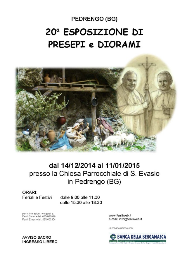 Ciao a tutti, siamo giunti già alla 20a edizione della mostra a Pedrengo (BG). Dal 14 dicembre 2014 al 11 gennaio 2015 vi aspettiamo numerosissimi. Fateci un colpo di telefono se passate e saremo contenti di incontrarvi.