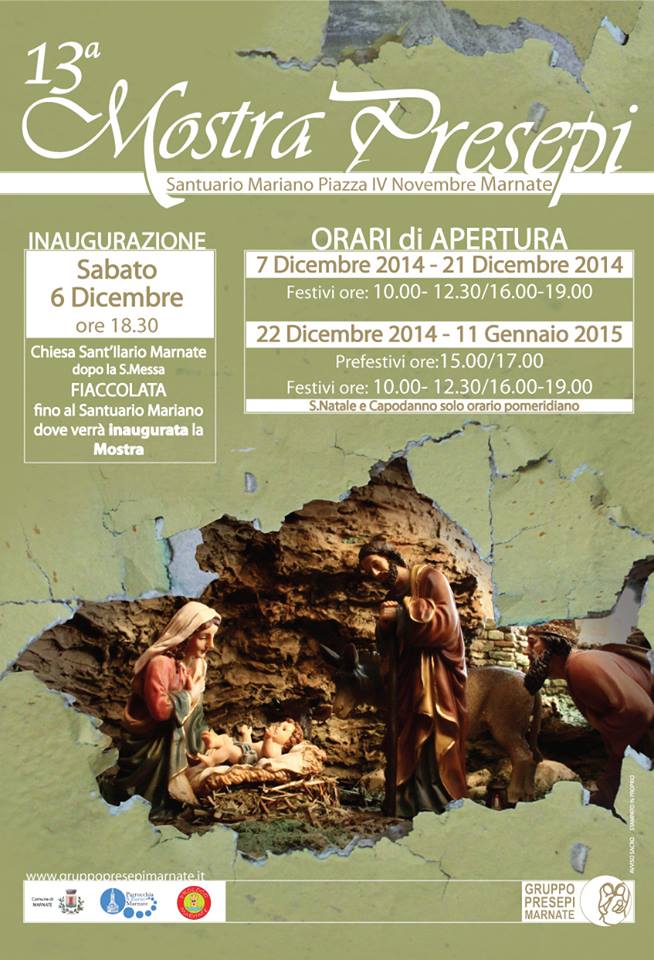 Ciao a tutti in ritardo inserisco la locandina della mostra Presepi di Marnate inaugurata sabato scorso con la fiaccolata dalla chiesa parrocchiale al Santuario portando la statua di Gesù Bambino che è stato collocato all'ingresso della mostra. Gli orari li trovate sulla locandina. Per visite fuori orario potete contattare il numero 3347833199 Saremo lieti di aprire agli amici che vorranno farci visita.