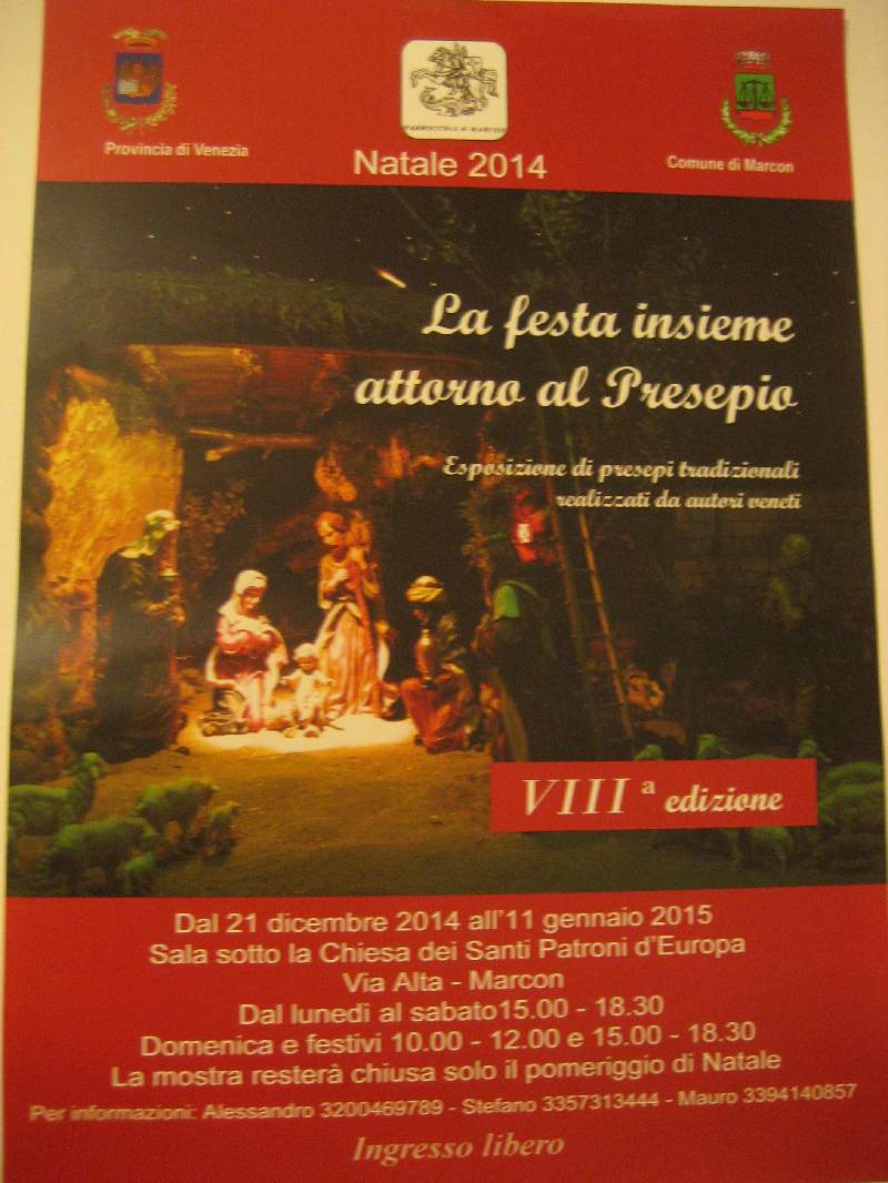 Sono lieto di presentare anche una mostra meno conosciuta ma che è giunta ormai alla ottava edizione. Si tratta di quella allestita a Marcon (Venezia) presso la sala espositiva posta sotto la chiesa dei SS. Patroni d'Europa. Aprirà i battenti domenica 21 dicembre alle ore 11,30 per chiudere domenica 11 gennaio 2015. Aperta tutti i giorni tranne il pomeriggio di Natale con i seguenti orari: Lun-Sab dalle 15,00 alle 18,30, domenica e festivi dalle 10,00 alle 12,00 e dalle 15,00 alle 18,30. Allego la locandina. Un saluto a tutti. Mike57.