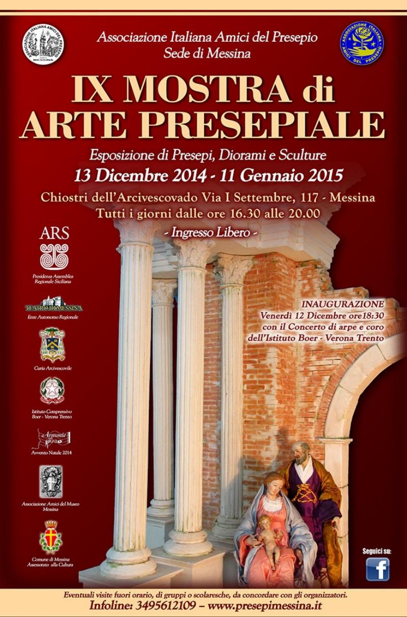 La mostra si terrà dal 13 Dicembre 2014 al 11 Gennaio 2015 presso i chiostri dell'arcivescovado e sarà visitabile tutti i giorni dalle 16:30 alle 20:00. Per vedere le foto delle opere esposte o altre notizie , potete visitare il sito web ufficiale dell'associazione http://www.presepimessina.it Se avete bisogno di ulteriori informazioni, potete contattarmi al seguente indirizzo: spadaro@svweb.it