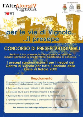 Ciao a tutti, vi segnalo questo concorso di presepi. Si terrà a Vignola (Mo) e, una volta iscritti gratuitamente entro il 15 novembre, si avrà tempo fino al 30 novembre per inviare il proprio lavoro che verrà esposto nelle vetrine dei negozi del centro storico.