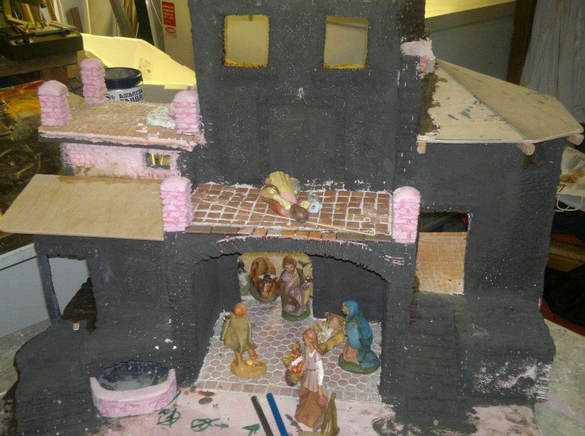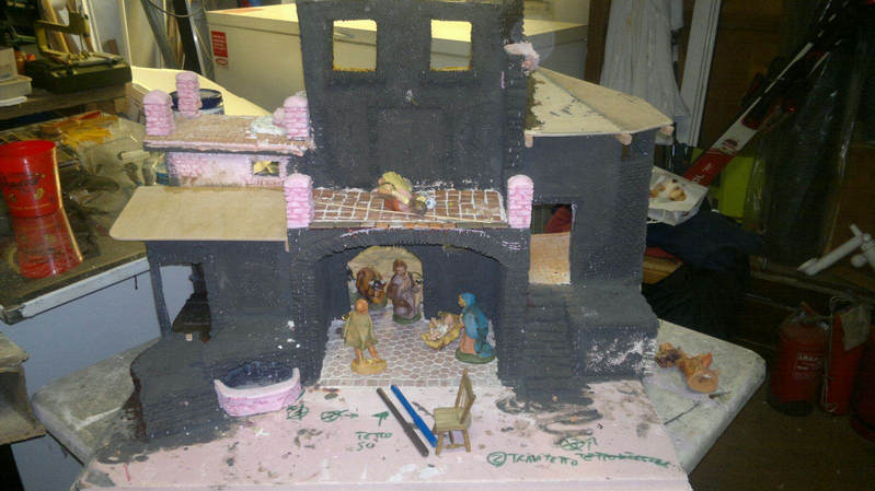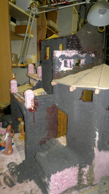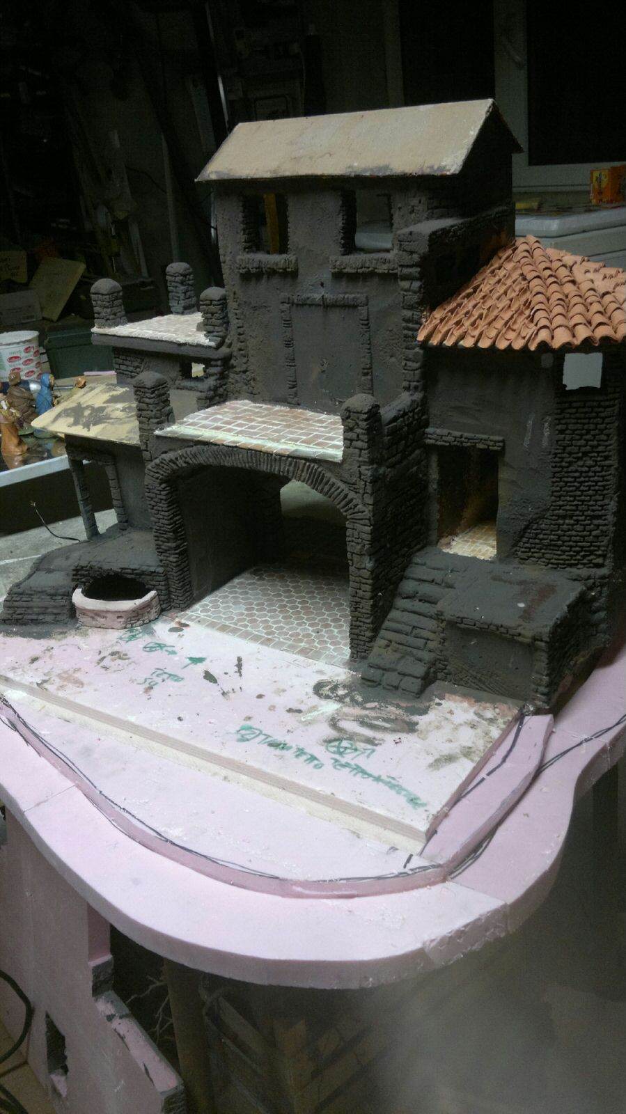 ecco .. i lavori proseguono... ho allargato un po' lapiazzetta.. pensavo di farla con i sanpietrini... tagkiati in polistirolo e poi incollati.. oggi finisco di mettere le tegole... |
