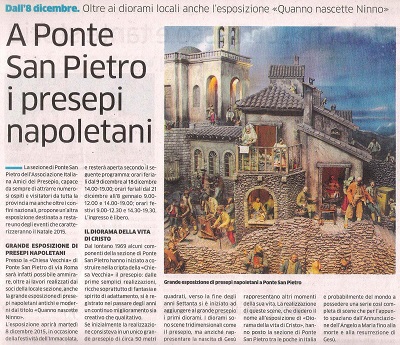 Ho fatto un giro (come ormai da quattro anni a questa parte) alla mostra di Ponte san Pietro. Che dire, il gruppo di Ponte non si smentisce! Ottima mostra e ottime opere esposte. Purtroppo non sono riuscito ad incontrarmi con Mauro (caniggia) ma ho avuto l'occasione di scambiare due chiacchere con Claudio Mattei a cui vanno i complimenti per il libro dedicato al presepio napoletano e alla mostra. Bravi tutti! Vale sicuramente la pena farci un giro. |