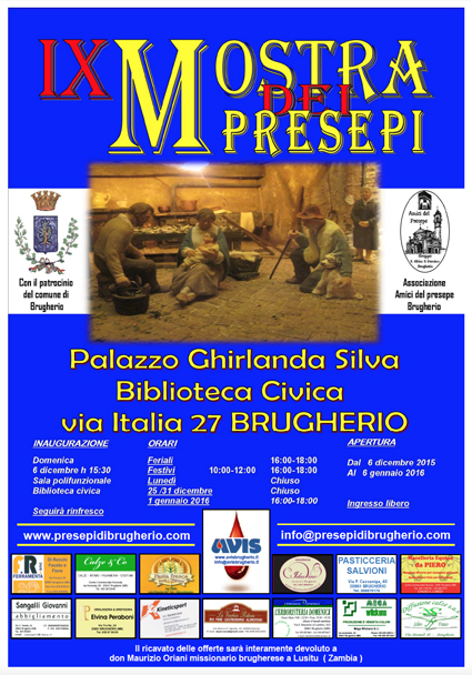 Ciao a tutti, volevo informarvi che domenica 6 Dicembre 2015, alle ore 15,30, ci sarà l'inaugurazione della" IX Mostra dei Presepi" presso la Biblioteca Civica in via Italia 27 a Brugherio. Siete tutti invitati.