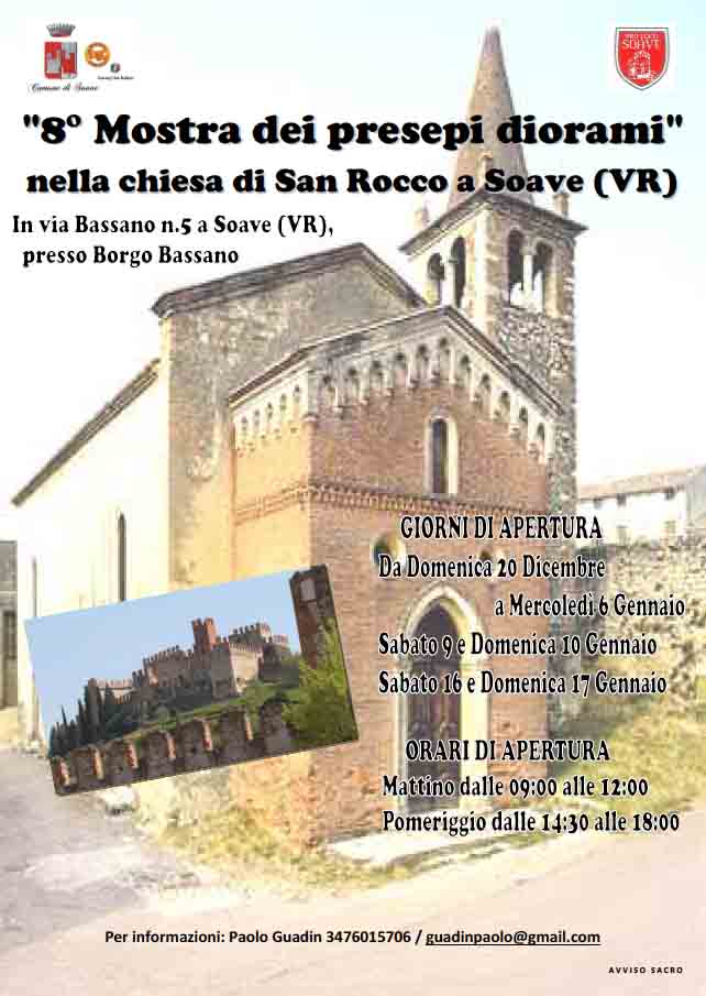 Salve a tutti gli amici del forum. Anche quest'anno si terrà a Soave l'ottava mostra dei presepi diorami presso la chiesa di S.Rocco in via Bassano. Sono presenti oltre venti opere provenienti da regioni del nord Italia. I giorni di apertura vanno dal 20 Dicembre al 6 Gennaio poi i fine settimana fino al 17 Gennaio. Aperture extra da concordare con Paolo Guadin Vi aspettiamo numerosi come sempre. Paolo