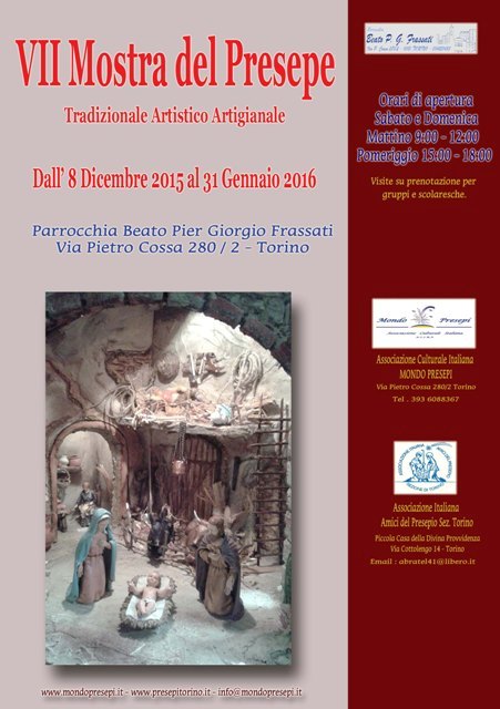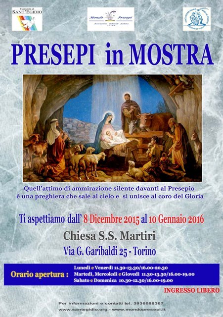 Quest'anno l'Associazione Culturale Italiana Mondo Presepi (A.C.I.M.P.) ha allestito a Torino ben due mostre: - la prima, nella Chiesa S.S. Martiri, ove sta riscuotendo un enorme successo; - la seconda, per il settimo anno consecutivo, nella parrocchia Beato Pier Giorgio Frassati. Gli indirizzi e gli orari di visita sono indicati nelle locandine. Per tutti gli appassionati, non perdete l'occasione per vedere i nostri presepi.