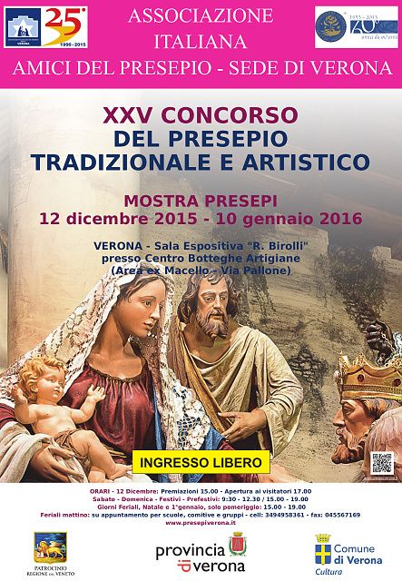 Cari Amici, vi informo che è aperta dal 12 dicembre 2015 la Mostra delle opere partecipanti al 25° Concorso del Presepio Tradizionale ed Artistico allestita dall'Associazione Italiana Amici del Presepio Sede di Verona.
